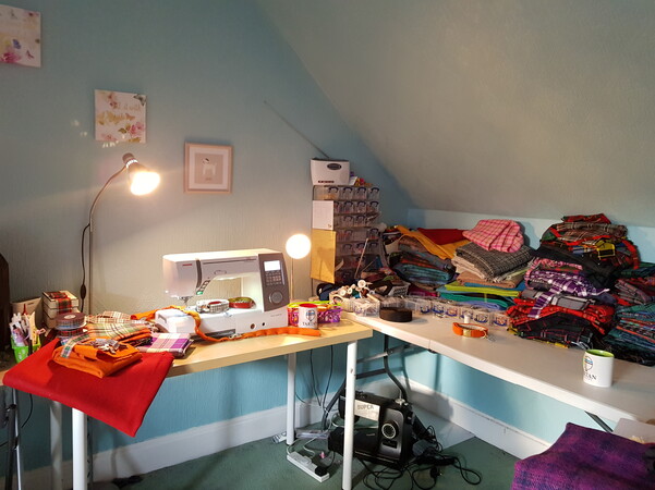 While he was doing his training I wondered what I could do to also raise funds. As Jock was going to be on show I wanted him to look his best and bought him a bandana. When this arrived it was a bit too large for him and I decided to alter it. Whilst doing this a seed formed in my head. Could I make bandanas myself to raise money? I bought myself a cheap sewing machine, some tartan fabric, and off I went.