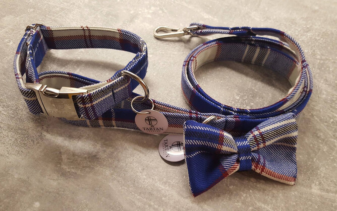 Next up we have the lovely Harris Clan Tartan. This is a new tartan added to our range this Spring and we love the fresh colours in this fabric of blue and cream with a splash of red. Starting from £32 for the set, with Collars from £14 and Leads at £20.